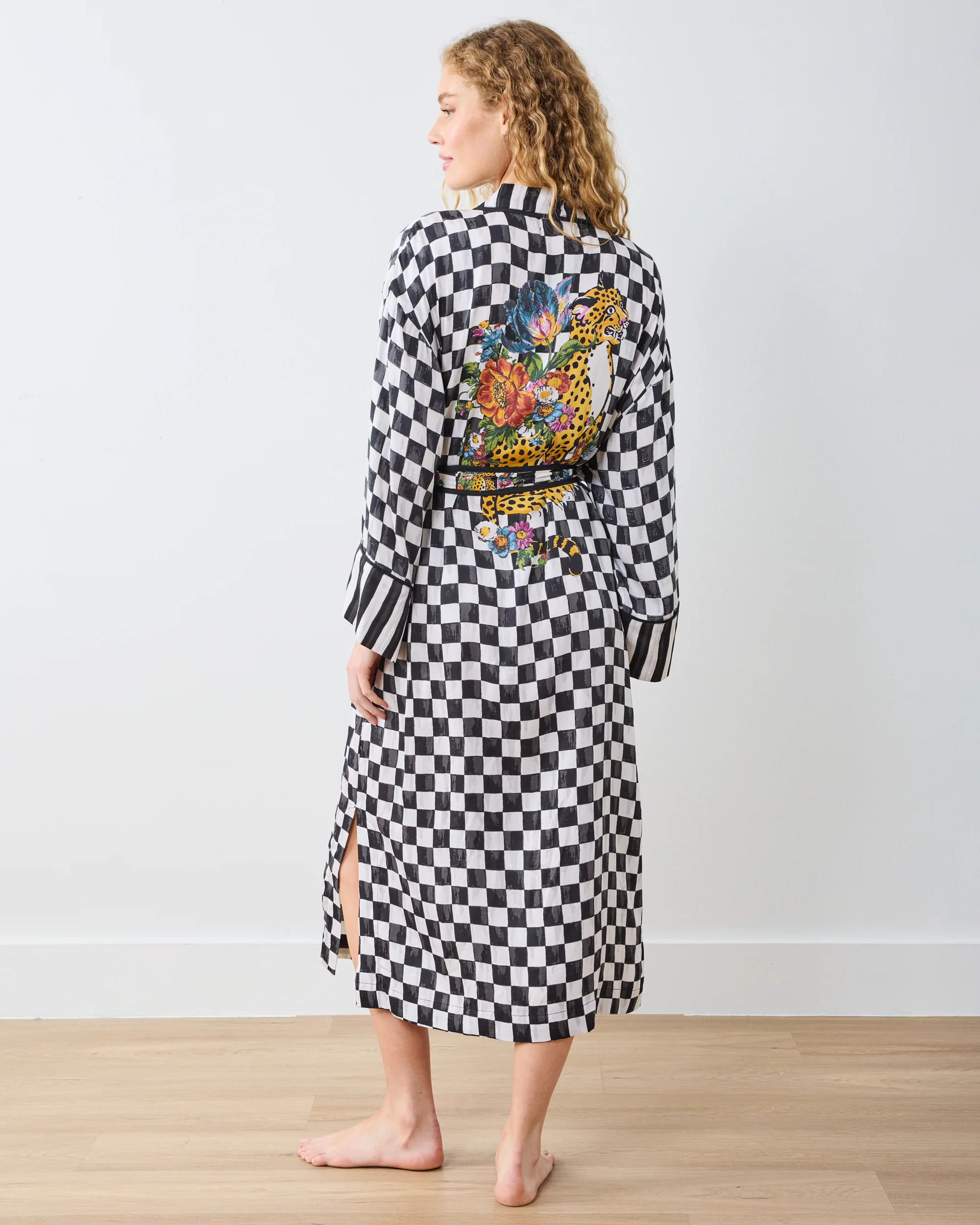 Unleash your wild side with our Courtly Check Bagheera satin robe from the MacKenzie-Childs x Printfresh collection. Inspired by MacKenzie-Childs' iconic checkered print, this exclusive robe features an eye-catching floral Bagheera leopard back. This satin robe with pockets transforms morning coffee into pure luxury. A lavish satin sleep robe that doubles as your favorite lounge robe. Shop our robes, satin pajamas, and the MacKenzie-Childs x Printfresh for more bold looks.
