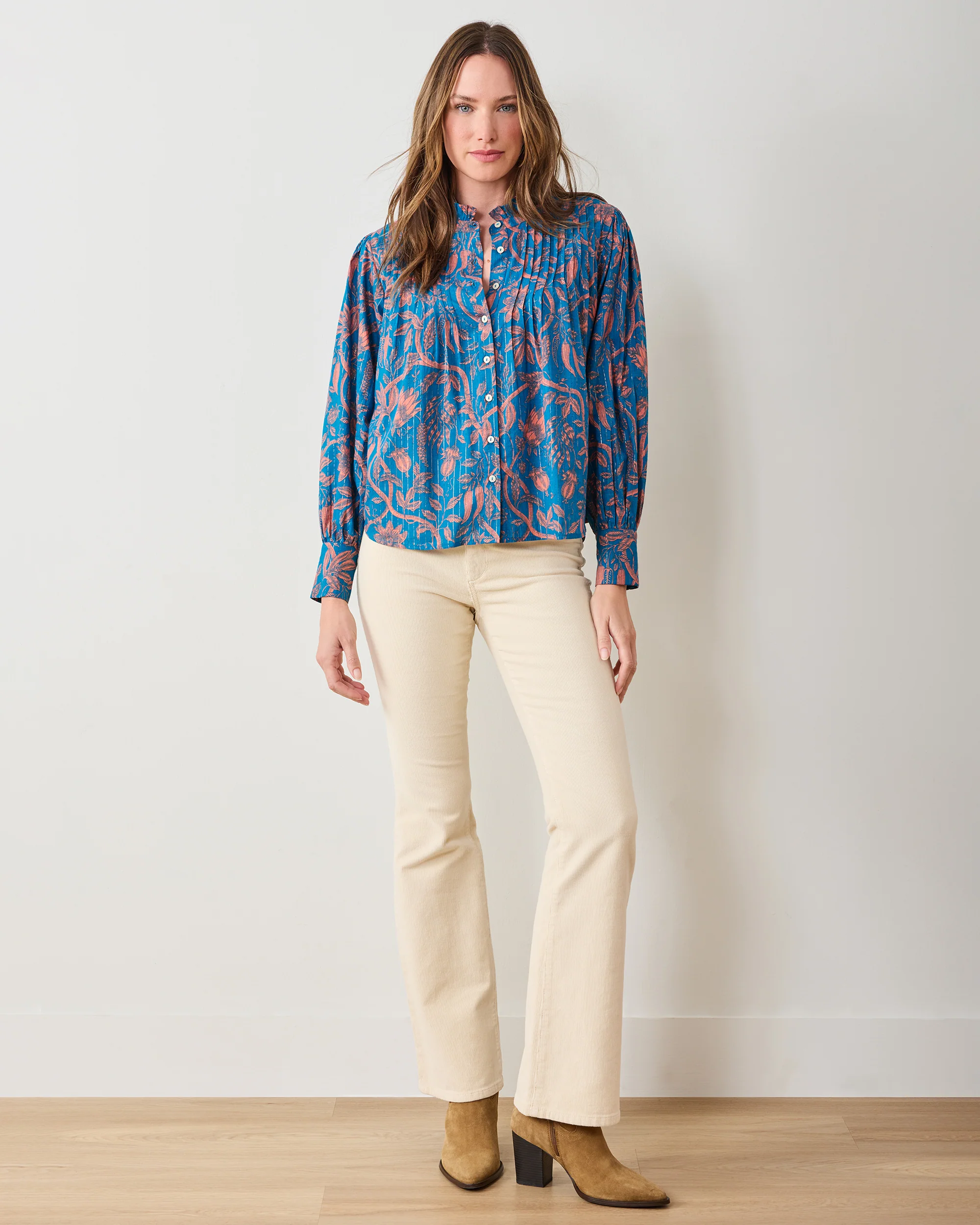 Make it a stylish fall in our On a Whim button blouse in Etched Vine, with delicate vines winding across Turquoise Blush organic cotton. This romantic puff sleeve blouse features an elegant high-neck floral top design with functional buttons and subtle shine. The relaxed fit works beautifully tucked or untucked. Perfect for adding a touch of elegance to your blouse collection. Discover more floral blouses and short-sleeve blouses.